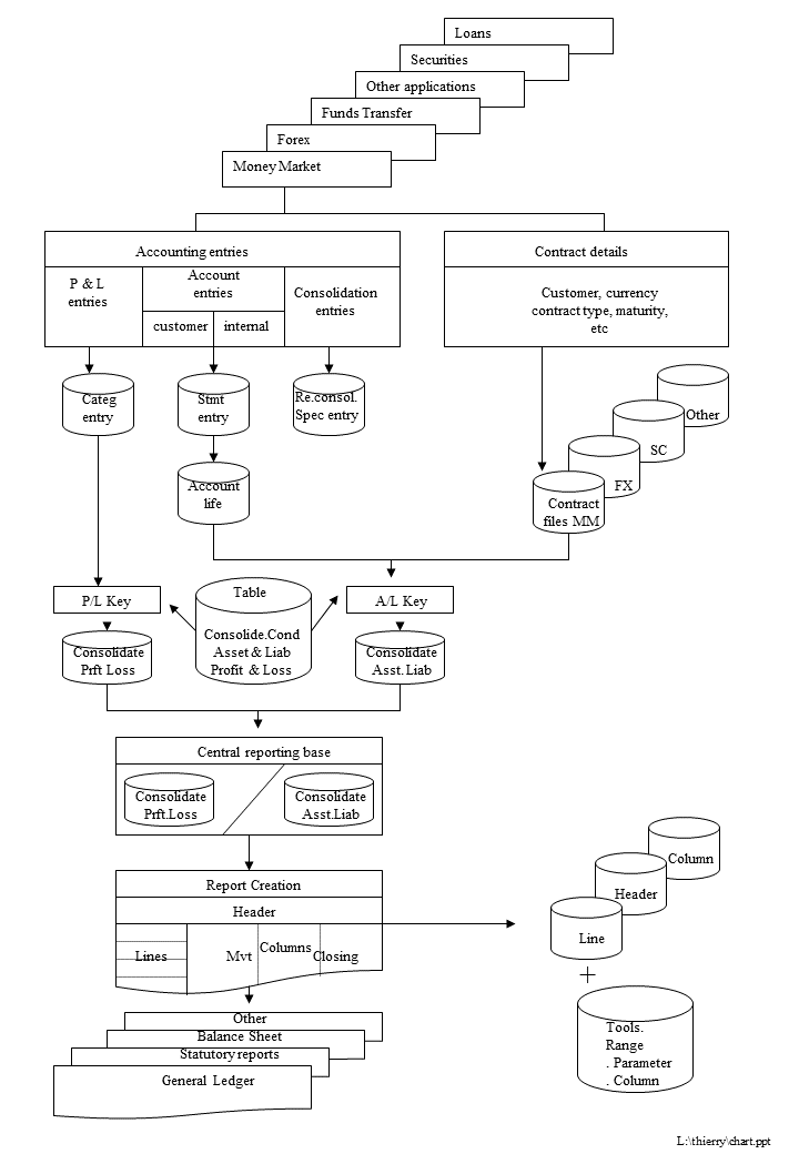 The financial reporting in GLOBUS will use, whenever possible, a single base as source for report generation. This base is called the CENTRAL.REPORTING FILE ‘(CRF)’. Account balances, principal outstanding amounts in product files and any related amount fields such as interest reserves, accrued charges, commissions, etc. held in each individual product record will be consolidated into records held on the ‘CRF’.
